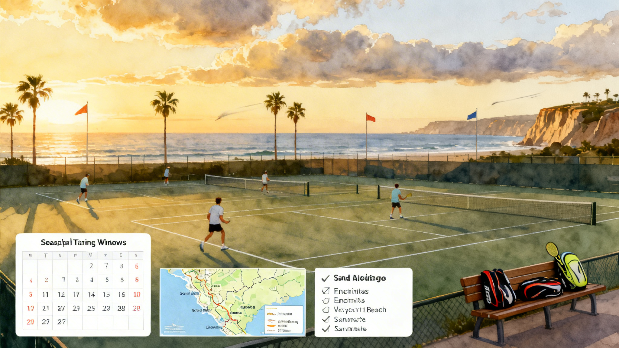 - San Clemente and Dana Point public courts: Reliable microclimate, light sea breeze, and dramatic coastal sunsets that make evening hits a treat.